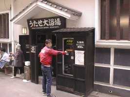 入浴料は300円。この自動販売機でメダルを買って入場する。メダルは入り口の回転ドアを1区間回すために使用する。