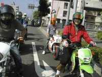 とある信号待ちでの一コマ。きびしい日ざしを避けて後方の木陰で信号を待っているのは最年長の岡松氏。ちゃっかりと木陰をみつけて止まるとはさすが!人生経験豊富!?