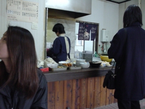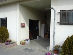 役場の駐車場に車を停め、さあ店に入ろうと写真右に見える正面入り口を開けようとすると鍵がかかっていて開かない。「あれ?定休日は日曜日のはずだし、開店時間は30分程過ぎているし、臨時休業なのか?」と思っているとうどんを食したであろう雰囲気のあるタクシーの運ちゃんが店の左側の路地から出てきたので聞いてみると、「ずっと路地を入って左奥に入り口が有るよ」と教えてくれた。 さすが”製麺所”! 一元客相手に親切に入り口の説明書きなど一切無い。味に自信がある証拠かも!?と、期待が高まる。